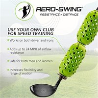 Aero-Swing is a patented golf swing trainer aid that allows a golfer to swing the club faster and hit the ball further. Best for practice, training equipment for golf.Hit golf balls while working on your speed with this golf swing speed trainer. Choose your level of resistance by adjusting or adding another aid to the club shaft. This golf training aid safely leverages wind resistance to strengthen key muscles for obtaining greater distances. It’s the easiest golf swing tool to help you with speed training.